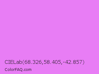 CIELab 68.326,58.405,-42.857 Color is a light magenta color and the nearest color is Lavender Magenta #ee82ee. Hex code #e87df5 and RGB value is rgb(232,125,245). In RGB color space, this color is composed of 91% red, 49% green, 96% blue, In CMYK color space, this color is composed of 5% cyan, 49% magenta, 0% yellow , 4% black , In HSL color space, this color has a hue angle of 294° , 86% saturation and 73% lightness.