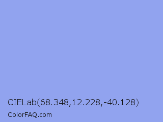 CIELab 68.348,12.228,-40.128 Color is a light blue color and the nearest color is Portage #8b9fee. Hex code #91a3ef and RGB value is rgb(145,163,239). In RGB color space, this color is composed of 57% red, 64% green, 94% blue, In CMYK color space, this color is composed of 39% cyan, 32% magenta, 0% yellow , 6% black , In HSL color space, this color has a hue angle of 229° , 75% saturation and 75% lightness.