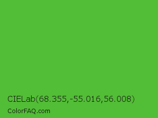 CIELab 68.355,-55.016,56.008 Color is a normal green color and the nearest color is Apple #4fa83d. Hex code #52bd36 and RGB value is rgb(82,189,54). In RGB color space, this color is composed of 32% red, 74% green, 21% blue, In CMYK color space, this color is composed of 57% cyan, 0% magenta, 71% yellow , 26% black , In HSL color space, this color has a hue angle of 108° , 56% saturation and 48% lightness.