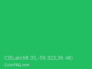 CIELab 68.35,-59.323,36.48 Color is a normal green color and the nearest color is Green Crayola #1cac78. Hex code #21bf61 and RGB value is rgb(33,191,97). In RGB color space, this color is composed of 13% red, 75% green, 38% blue, In CMYK color space, this color is composed of 83% cyan, 0% magenta, 49% yellow , 25% black , In HSL color space, this color has a hue angle of 144° , 71% saturation and 44% lightness.