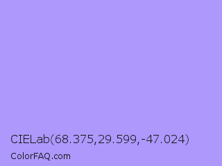 CIELab 68.375,29.599,-47.024 Color is a light indigo color and the nearest color is Biloba Flower #b2a1ea. Hex code #ae98fc and RGB value is rgb(174,152,252). In RGB color space, this color is composed of 68% red, 60% green, 99% blue, In CMYK color space, this color is composed of 31% cyan, 40% magenta, 0% yellow , 1% black , In HSL color space, this color has a hue angle of 253° , 94% saturation and 79% lightness.