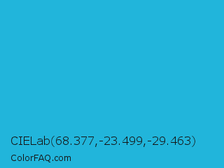 CIELab 68.377,-23.499,-29.463 Color is a normal cyan color and the nearest color is Battery Charged Blue #1dacd6. Hex code #21b5db and RGB value is rgb(33,181,219). In RGB color space, this color is composed of 13% red, 71% green, 86% blue, In CMYK color space, this color is composed of 85% cyan, 17% magenta, 0% yellow , 14% black , In HSL color space, this color has a hue angle of 192° , 74% saturation and 49% lightness.
