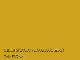 CIELab 68.377,3.022,66.856 Color is a normal yellow color and the nearest color is Lemon Curry #cca01d. Hex code #caa21d and RGB value is rgb(202,162,29). In RGB color space, this color is composed of 79% red, 64% green, 11% blue, In CMYK color space, this color is composed of 0% cyan, 20% magenta, 86% yellow , 21% black , In HSL color space, this color has a hue angle of 46° , 75% saturation and 45% lightness.