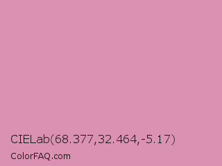 CIELab 68.377,32.464,-5.17 Color is a light rose color and the nearest color is Light Thulian Pink #e68fac. Hex code #db91b1 and RGB value is rgb(219,145,177). In RGB color space, this color is composed of 86% red, 57% green, 69% blue, In CMYK color space, this color is composed of 0% cyan, 34% magenta, 19% yellow , 14% black , In HSL color space, this color has a hue angle of 334° , 51% saturation and 71% lightness.