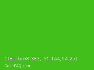 CIELab 68.383,-61.144,64.25 Color is a normal green color and the nearest color is Kelly Green #4cbb17. Hex code #42bf1a and RGB value is rgb(66,191,26). In RGB color space, this color is composed of 26% red, 75% green, 10% blue, In CMYK color space, this color is composed of 65% cyan, 0% magenta, 86% yellow , 25% black , In HSL color space, this color has a hue angle of 105° , 76% saturation and 43% lightness.