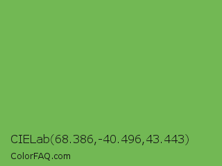 CIELab 68.386,-40.496,43.443 Color is a normal green color and the nearest color is Bud Green #7bb661. Hex code #72b854 and RGB value is rgb(114,184,84). In RGB color space, this color is composed of 45% red, 72% green, 33% blue, In CMYK color space, this color is composed of 38% cyan, 0% magenta, 54% yellow , 28% black , In HSL color space, this color has a hue angle of 102° , 41% saturation and 53% lightness.