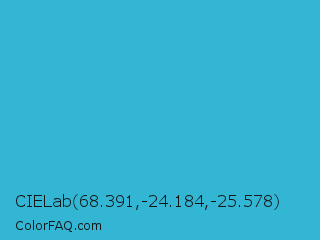 CIELab 68.391,-24.184,-25.578 Color is a normal cyan color and the nearest color is Scooter #2ebfd4. Hex code #33b5d4 and RGB value is rgb(51,181,212). In RGB color space, this color is composed of 20% red, 71% green, 83% blue, In CMYK color space, this color is composed of 76% cyan, 15% magenta, 0% yellow , 17% black , In HSL color space, this color has a hue angle of 192° , 65% saturation and 52% lightness.