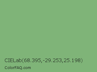 CIELab 68.395,-29.253,25.198 Color is a normal green color and the nearest color is Iguana Green #71bc78. Hex code #7fb478 and RGB value is rgb(127,180,120). In RGB color space, this color is composed of 50% red, 71% green, 47% blue, In CMYK color space, this color is composed of 29% cyan, 0% magenta, 33% yellow , 29% black , In HSL color space, this color has a hue angle of 113° , 29% saturation and 59% lightness.