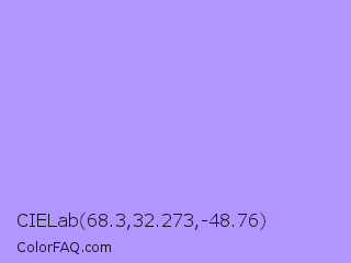 CIELab 68.3,32.273,-48.76 Color is a light indigo color and the nearest color is Biloba Flower #b2a1ea. Hex code #b196ff and RGB value is rgb(177,150,255). In RGB color space, this color is composed of 69% red, 59% green, 100% blue, In CMYK color space, this color is composed of 31% cyan, 41% magenta, 0% yellow , 0% black , In HSL color space, this color has a hue angle of 255° , 100% saturation and 79% lightness.