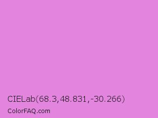 CIELab 68.3,48.831,-30.266 Color is a light magenta color and the nearest color is Lavender Magenta #ee82ee. Hex code #e385de and RGB value is rgb(227,133,222). In RGB color space, this color is composed of 89% red, 52% green, 87% blue, In CMYK color space, this color is composed of 0% cyan, 41% magenta, 2% yellow , 11% black , In HSL color space, this color has a hue angle of 303° , 63% saturation and 71% lightness.
