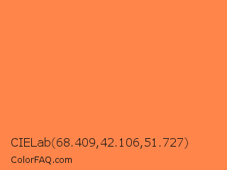 CIELab 68.409,42.106,51.727 Color is a light orange color and the nearest color is Mango Tango #ff8243. Hex code #ff854a and RGB value is rgb(255,133,74). In RGB color space, this color is composed of 100% red, 52% green, 29% blue, In CMYK color space, this color is composed of 0% cyan, 48% magenta, 71% yellow , 0% black , In HSL color space, this color has a hue angle of 20° , 100% saturation and 65% lightness.