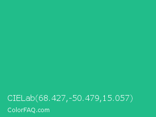 CIELab 68.427,-50.479,15.057 Color is a normal green color and the nearest color is Mountain Meadow Crayola #1ab385. Hex code #21bd8a and RGB value is rgb(33,189,138). In RGB color space, this color is composed of 13% red, 74% green, 54% blue, In CMYK color space, this color is composed of 83% cyan, 0% magenta, 27% yellow , 26% black , In HSL color space, this color has a hue angle of 160° , 70% saturation and 44% lightness.