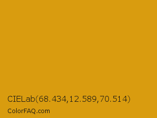 CIELab 68.434,12.589,70.514 Color is a normal orange color and the nearest color is Gamboge #e49b0f. Hex code #d99c0f and RGB value is rgb(217,156,15). In RGB color space, this color is composed of 85% red, 61% green, 6% blue, In CMYK color space, this color is composed of 0% cyan, 28% magenta, 93% yellow , 15% black , In HSL color space, this color has a hue angle of 42° , 87% saturation and 45% lightness.
