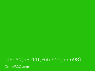 CIELab 68.441,-66.954,66.698 Color is a normal green color and the nearest color is Harlequin Green #46cb18. Hex code #26c10a and RGB value is rgb(38,193,10). In RGB color space, this color is composed of 15% red, 76% green, 4% blue, In CMYK color space, this color is composed of 80% cyan, 0% magenta, 95% yellow , 24% black , In HSL color space, this color has a hue angle of 111° , 90% saturation and 40% lightness.
