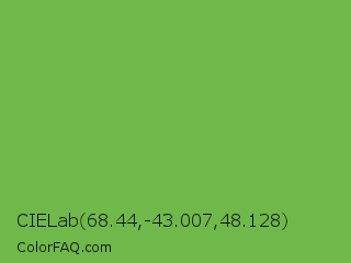 CIELab 68.44,-43.007,48.128 Color is a normal green color and the nearest color is Bud Green #7bb661. Hex code #6fb94a and RGB value is rgb(111,185,74). In RGB color space, this color is composed of 44% red, 73% green, 29% blue, In CMYK color space, this color is composed of 40% cyan, 0% magenta, 60% yellow , 27% black , In HSL color space, this color has a hue angle of 100° , 44% saturation and 51% lightness.