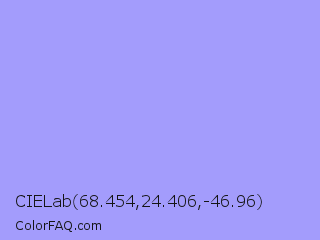 CIELab 68.454,24.406,-46.96 Color is a light indigo color and the nearest color is Dull Lavender #a899e6. Hex code #a39cfc and RGB value is rgb(163,156,252). In RGB color space, this color is composed of 64% red, 61% green, 99% blue, In CMYK color space, this color is composed of 35% cyan, 38% magenta, 0% yellow , 1% black , In HSL color space, this color has a hue angle of 244° , 94% saturation and 80% lightness.