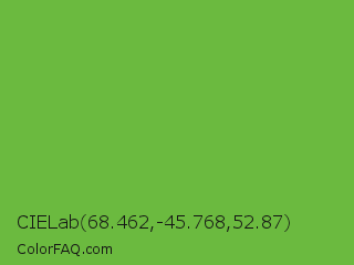 CIELab 68.462,-45.768,52.87 Color is a normal green color and the nearest color is Green RYB #66b032. Hex code #6bba3f and RGB value is rgb(107,186,63). In RGB color space, this color is composed of 42% red, 73% green, 25% blue, In CMYK color space, this color is composed of 42% cyan, 0% magenta, 66% yellow , 27% black , In HSL color space, this color has a hue angle of 99° , 49% saturation and 49% lightness.