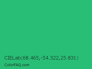 CIELab 68.465,-54.322,25.831 Color is a normal green color and the nearest color is Green Crayola #1cac78. Hex code #29be76 and RGB value is rgb(41,190,118). In RGB color space, this color is composed of 16% red, 75% green, 46% blue, In CMYK color space, this color is composed of 78% cyan, 0% magenta, 38% yellow , 25% black , In HSL color space, this color has a hue angle of 151° , 65% saturation and 45% lightness.
