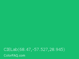 CIELab 68.47,-57.527,28.945 Color is a normal green color and the nearest color is Green Crayola #1cac78. Hex code #17bf70 and RGB value is rgb(23,191,112). In RGB color space, this color is composed of 9% red, 75% green, 44% blue, In CMYK color space, this color is composed of 88% cyan, 0% magenta, 41% yellow , 25% black , In HSL color space, this color has a hue angle of 152° , 79% saturation and 42% lightness.