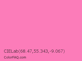 CIELab 68.47,55.343,-9.067 Color is a light rose color and the nearest color is Persian Pink #f77fbe. Hex code #fc7cb9 and RGB value is rgb(252,124,185). In RGB color space, this color is composed of 99% red, 49% green, 73% blue, In CMYK color space, this color is composed of 0% cyan, 51% magenta, 27% yellow , 1% black , In HSL color space, this color has a hue angle of 331° , 96% saturation and 74% lightness.