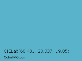 CIELab 68.481,-20.337,-19.85 Color is a normal cyan color and the nearest color is Fountain Blue #56b4be. Hex code #59b3ca and RGB value is rgb(89,179,202). In RGB color space, this color is composed of 35% red, 70% green, 79% blue, In CMYK color space, this color is composed of 56% cyan, 11% magenta, 0% yellow , 21% black , In HSL color space, this color has a hue angle of 192° , 52% saturation and 57% lightness.