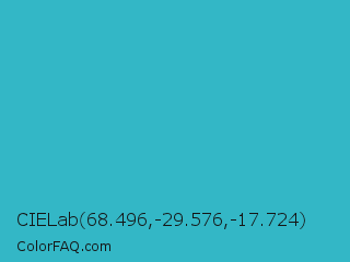 CIELab 68.496,-29.576,-17.724 Color is a normal cyan color and the nearest color is Maximum Blue Green #30bfbf. Hex code #33b7c6 and RGB value is rgb(51,183,198). In RGB color space, this color is composed of 20% red, 72% green, 78% blue, In CMYK color space, this color is composed of 74% cyan, 8% magenta, 0% yellow , 22% black , In HSL color space, this color has a hue angle of 186° , 59% saturation and 49% lightness.