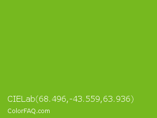 CIELab 68.496,-43.559,63.936 Color is a normal green color and the nearest color is Lima #76bd17. Hex code #76b91f and RGB value is rgb(118,185,31). In RGB color space, this color is composed of 46% red, 73% green, 12% blue, In CMYK color space, this color is composed of 36% cyan, 0% magenta, 83% yellow , 27% black , In HSL color space, this color has a hue angle of 86° , 71% saturation and 42% lightness.
