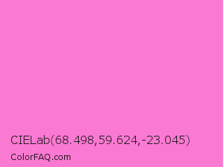 CIELab 68.498,59.624,-23.045 Color is a light magenta color and the nearest color is Princess Perfume #ff85cf. Hex code #fa79d2 and RGB value is rgb(250,121,210). In RGB color space, this color is composed of 98% red, 47% green, 82% blue, In CMYK color space, this color is composed of 0% cyan, 52% magenta, 16% yellow , 2% black , In HSL color space, this color has a hue angle of 319° , 93% saturation and 73% lightness.
