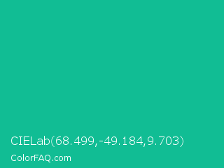 CIELab 68.499,-49.184,9.703 Color is a normal cyan color and the nearest color is Mountain Meadow Crayola #1ab385. Hex code #11bd94 and RGB value is rgb(17,189,148). In RGB color space, this color is composed of 7% red, 74% green, 58% blue, In CMYK color space, this color is composed of 91% cyan, 0% magenta, 22% yellow , 26% black , In HSL color space, this color has a hue angle of 166° , 83% saturation and 40% lightness.
