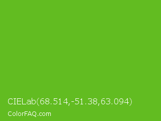 CIELab 68.514,-51.38,63.094 Color is a normal green color and the nearest color is Green RYB #66b032. Hex code #62bc21 and RGB value is rgb(98,188,33). In RGB color space, this color is composed of 38% red, 74% green, 13% blue, In CMYK color space, this color is composed of 48% cyan, 0% magenta, 82% yellow , 26% black , In HSL color space, this color has a hue angle of 95° , 70% saturation and 43% lightness.