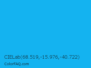 CIELab 68.519,-15.976,-40.722 Color is a normal blue color and the nearest color is Spiro Disco Ball #0fc0fc. Hex code #14b3f0 and RGB value is rgb(20,179,240). In RGB color space, this color is composed of 8% red, 70% green, 94% blue, In CMYK color space, this color is composed of 92% cyan, 25% magenta, 0% yellow , 6% black , In HSL color space, this color has a hue angle of 197° , 88% saturation and 51% lightness.