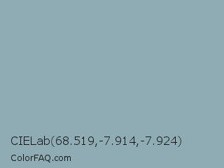CIELab 68.519,-7.914,-7.924 Color is a light blue color and the nearest color is Pewter Blue #8ba8b7. Hex code #8facb5 and RGB value is rgb(143,172,181). In RGB color space, this color is composed of 56% red, 67% green, 71% blue, In CMYK color space, this color is composed of 21% cyan, 5% magenta, 0% yellow , 29% black , In HSL color space, this color has a hue angle of 194° , 20% saturation and 64% lightness.