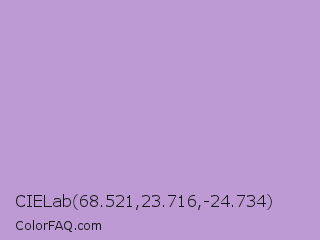 CIELab 68.521,23.716,-24.734 Color is a light purple color and the nearest color is Light Pastel Purple #b19cd9. Hex code #bd9ad4 and RGB value is rgb(189,154,212). In RGB color space, this color is composed of 74% red, 60% green, 83% blue, In CMYK color space, this color is composed of 11% cyan, 27% magenta, 0% yellow , 17% black , In HSL color space, this color has a hue angle of 276° , 40% saturation and 72% lightness.