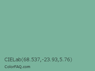 CIELab 68.537,-23.93,5.76 Color is a normal green color and the nearest color is Acapulco #7cb0a1. Hex code #79b39c and RGB value is rgb(121,179,156). In RGB color space, this color is composed of 47% red, 70% green, 61% blue, In CMYK color space, this color is composed of 32% cyan, 0% magenta, 13% yellow , 30% black , In HSL color space, this color has a hue angle of 156° , 28% saturation and 59% lightness.
