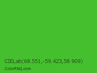 CIELab 68.551,-59.423,58.909 Color is a normal green color and the nearest color is Wageningen Green #34b233. Hex code #45bf2e and RGB value is rgb(69,191,46). In RGB color space, this color is composed of 27% red, 75% green, 18% blue, In CMYK color space, this color is composed of 64% cyan, 0% magenta, 76% yellow , 25% black , In HSL color space, this color has a hue angle of 110° , 61% saturation and 46% lightness.