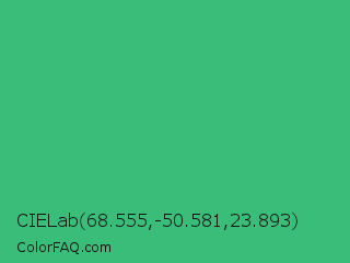 CIELab 68.555,-50.581,23.893 Color is a normal green color and the nearest color is Medium Sea Green #3cb371. Hex code #3bbd7a and RGB value is rgb(59,189,122). In RGB color space, this color is composed of 23% red, 74% green, 48% blue, In CMYK color space, this color is composed of 69% cyan, 0% magenta, 35% yellow , 26% black , In HSL color space, this color has a hue angle of 149° , 52% saturation and 49% lightness.