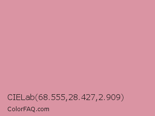 CIELab 68.555,28.427,2.909 Color is a light red color and the nearest color is Parrot Pink #d998a0. Hex code #da94a3 and RGB value is rgb(218,148,163). In RGB color space, this color is composed of 85% red, 58% green, 64% blue, In CMYK color space, this color is composed of 0% cyan, 32% magenta, 25% yellow , 15% black , In HSL color space, this color has a hue angle of 347° , 49% saturation and 72% lightness.