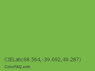 CIELab 68.564,-39.692,49.287 Color is a normal green color and the nearest color is Sushi #87ab39. Hex code #78b848 and RGB value is rgb(120,184,72). In RGB color space, this color is composed of 47% red, 72% green, 28% blue, In CMYK color space, this color is composed of 35% cyan, 0% magenta, 61% yellow , 28% black , In HSL color space, this color has a hue angle of 94° , 44% saturation and 50% lightness.