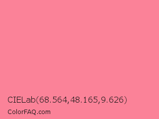 CIELab 68.564,48.165,9.626 Color is a light red color and the nearest color is Tulip #ff878d. Hex code #fb8298 and RGB value is rgb(251,130,152). In RGB color space, this color is composed of 98% red, 51% green, 60% blue, In CMYK color space, this color is composed of 0% cyan, 48% magenta, 39% yellow , 2% black , In HSL color space, this color has a hue angle of 349° , 94% saturation and 75% lightness.