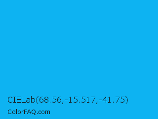 CIELab 68.56,-15.517,-41.75 Color is a normal blue color and the nearest color is Cyan Process #00b7eb. Hex code #0db3f2 and RGB value is rgb(13,179,242). In RGB color space, this color is composed of 5% red, 70% green, 95% blue, In CMYK color space, this color is composed of 95% cyan, 26% magenta, 0% yellow , 5% black , In HSL color space, this color has a hue angle of 197° , 90% saturation and 50% lightness.