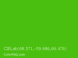 CIELab 68.571,-59.686,66.476 Color is a normal green color and the nearest color is Kelly Green #4cbb17. Hex code #4abf0f and RGB value is rgb(74,191,15). In RGB color space, this color is composed of 29% red, 75% green, 6% blue, In CMYK color space, this color is composed of 61% cyan, 0% magenta, 92% yellow , 25% black , In HSL color space, this color has a hue angle of 100° , 85% saturation and 40% lightness.