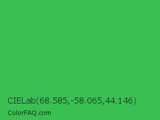 CIELab 68.585,-58.065,44.146 Color is a normal green color and the nearest color is Chateau Green #40a860. Hex code #3abf52 and RGB value is rgb(58,191,82). In RGB color space, this color is composed of 23% red, 75% green, 32% blue, In CMYK color space, this color is composed of 70% cyan, 0% magenta, 57% yellow , 25% black , In HSL color space, this color has a hue angle of 131° , 53% saturation and 49% lightness.