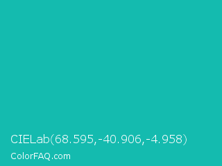 CIELab 68.595,-40.906,-4.958 Color is a normal cyan color and the nearest color is Tiffany Blue #0abab5. Hex code #14bbaf and RGB value is rgb(20,187,175). In RGB color space, this color is composed of 8% red, 73% green, 69% blue, In CMYK color space, this color is composed of 89% cyan, 0% magenta, 6% yellow , 27% black , In HSL color space, this color has a hue angle of 176° , 81% saturation and 41% lightness.