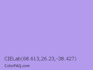 CIELab 68.613,26.23,-38.427 Color is a light indigo color and the nearest color is Biloba Flower #b2a1ea. Hex code #b39aed and RGB value is rgb(179,154,237). In RGB color space, this color is composed of 70% red, 60% green, 93% blue, In CMYK color space, this color is composed of 24% cyan, 35% magenta, 0% yellow , 7% black , In HSL color space, this color has a hue angle of 258° , 70% saturation and 77% lightness.