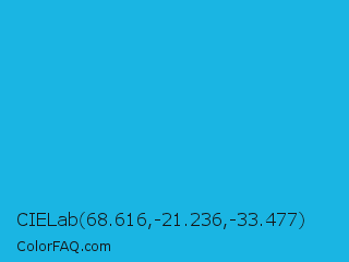 CIELab 68.616,-21.236,-33.477 Color is a normal blue color and the nearest color is Battery Charged Blue #1dacd6. Hex code #1ab5e3 and RGB value is rgb(26,181,227). In RGB color space, this color is composed of 10% red, 71% green, 89% blue, In CMYK color space, this color is composed of 89% cyan, 20% magenta, 0% yellow , 11% black , In HSL color space, this color has a hue angle of 194° , 79% saturation and 50% lightness.