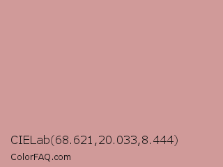 CIELab 68.621,20.033,8.444 Color is a light red color and the nearest color is Eunry #cfa39d. Hex code #d09a99 and RGB value is rgb(208,154,153). In RGB color space, this color is composed of 82% red, 60% green, 60% blue, In CMYK color space, this color is composed of 0% cyan, 26% magenta, 26% yellow , 18% black , In HSL color space, this color has a hue angle of 1° , 37% saturation and 71% lightness.