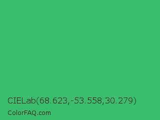 CIELab 68.623,-53.558,30.279 Color is a normal green color and the nearest color is Medium Sea Green #3cb371. Hex code #39be6e and RGB value is rgb(57,190,110). In RGB color space, this color is composed of 22% red, 75% green, 43% blue, In CMYK color space, this color is composed of 70% cyan, 0% magenta, 42% yellow , 25% black , In HSL color space, this color has a hue angle of 144° , 54% saturation and 48% lightness.