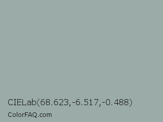 CIELab 68.623,-6.517,-0.488 Color is a light cyan color and the nearest color is Pewter #96a8a1. Hex code #9aaba8 and RGB value is rgb(154,171,168). In RGB color space, this color is composed of 60% red, 67% green, 66% blue, In CMYK color space, this color is composed of 10% cyan, 0% magenta, 2% yellow , 33% black , In HSL color space, this color has a hue angle of 169° , 9% saturation and 64% lightness.