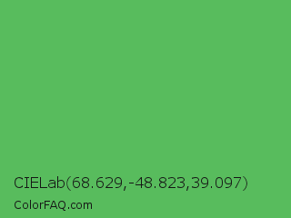 CIELab 68.629,-48.823,39.097 Color is a normal green color and the nearest color is Fern #63b76c. Hex code #58bc5d and RGB value is rgb(88,188,93). In RGB color space, this color is composed of 35% red, 74% green, 36% blue, In CMYK color space, this color is composed of 53% cyan, 0% magenta, 51% yellow , 26% black , In HSL color space, this color has a hue angle of 123° , 43% saturation and 54% lightness.