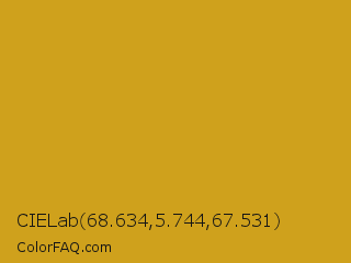 CIELab 68.634,5.744,67.531 Color is a normal orange color and the nearest color is Lemon Curry #cca01d. Hex code #cfa11c and RGB value is rgb(207,161,28). In RGB color space, this color is composed of 81% red, 63% green, 11% blue, In CMYK color space, this color is composed of 0% cyan, 22% magenta, 86% yellow , 19% black , In HSL color space, this color has a hue angle of 45° , 76% saturation and 46% lightness.